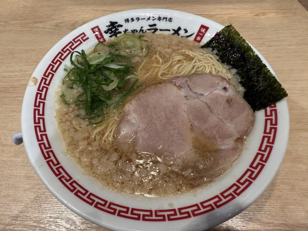 博多の定番「豚骨ラーメン」ははずせません。“町の豚骨”をコンセプトとする 幸ちゃんラーメンは、シンプルで何度でも食べたくなる味。細麺に豚骨スープが絡む毎日食べても飽きないスタイル が特徴です。